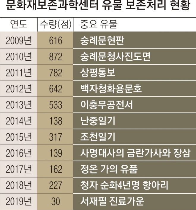 이곳에서 보존처리를 마치고 원래 소장처로 돌아간 유물은 지난해까지 총 4458점이다. 숭례문현판, 보물 제326호 이충무공유물, 국보 제76호 난중일기, 국보 제326호 청자 ‘순화4년’명 항아리 등이 대표적이다. 고려청자의 기원으로 평가받는 청자 ‘순화4년’명 항아리는 1년 6개월간 보존처리를 받고 2018년 소장처인 이화여대박물관에 인계됐다. 이 유물은 국립중앙박물관에서 현재 전시 중인 ‘새 보물 납시었네, 신국보보물전’에서 만날 수 있다.