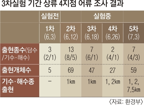수생태계 측면에서는 하굿둑 상류(4지점)와 하류(1지점)를 조사한 결과 개방 후 둑 상류에서 전반적으로 물고기 종수와 개체 수가 증가했다. 고등어·농어뿐만 아니라 청멸치 무리와 전갱이 등 해수 어종이 수문을 통해 이동하는 모습도 확인됐다. 각 기관들은 1∼3차 실험 결과를 분석해 ‘낙동강 하구 기수생태계 복원 방안’을 올해 안에 마련할 예정이다.