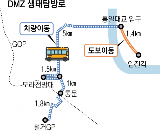 파주 구간은 임진각에서 출발해 임진강변 생태탐방로 철책선을 따라 1.4㎞를 걸어서 통일대교 입구까지 이동한 후 버스로 도라전망대와 지금은 철거된 감시초소까지 둘러본 뒤 임진각으로 돌아오는 일정이다. 전체 거리는 21㎞로 탐방에 3시간이 걸린다. 분단의 상징으로 장단역에서 폭격을 받아 반세기 동안 방치돼 있던 경의선 증기기관차가 임진각에 전시돼 있고, 비무장지대에선 폭격으로 파괴된 옛 장단면사무소도 확인할 수 있다.
