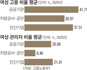 25일 고용노동부에 따르면 올해 적극적 고용개선조치 대상인 공공기관 가운데 43.5%(148곳), 지방공사·공단 중 63.6%(96곳)가 적극적 고용개선조치 기준을 충족하지 못했다. 적극적 고용개선조치는 ‘남녀고용평등과 일·가정 양립 지원에 관한 법률’(남녀고용평등법)에 근거해 공공기관(340개사), 지방공사·공단(151개사), 500인 이상 민간기업(1995개사)이 여성 노동자와 관리자 비율을 산업별·규모별 평균의 70% 이상으로 유지하도록 하는 제도다. 하지만 실제로는 공공부문뿐 아니라 500인 이상 민간기업 중에서도 48.2%(961곳)는 기준 미달이었다.
