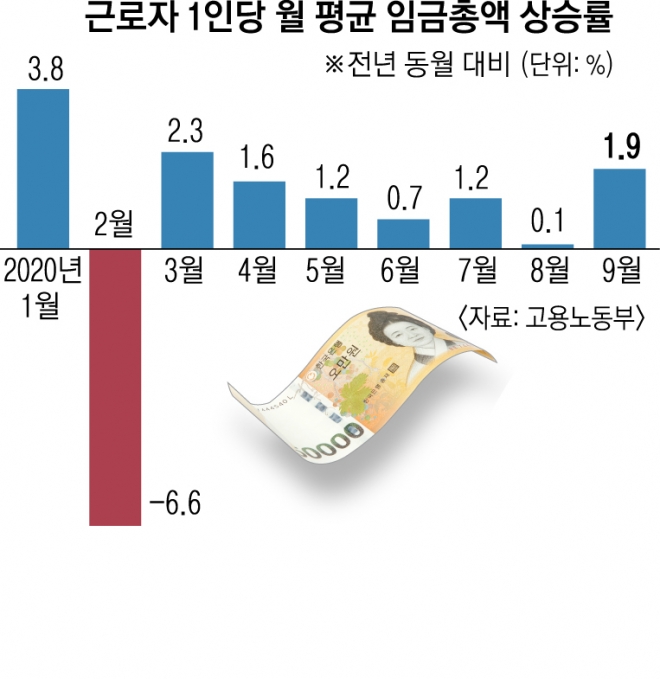 지난 9월 기준 상용직 1인 이상 사업체의 전체 근로자 임금총액은 지난해 같은 달보다 1.9% 상승했다. 코로나19가 확산한 지난 3월 이후 가장 높은 임금상승률이다. 9월 기준 전체 근로자 1인당 임금총액은 평균 381만 6000원으로, 지난해 같은 달보다 7만원(1.9%) 올랐다. 상용직 임금은 403만 9000원으로 5만 9000원(1.5%) 상승했고 임시·일용직 임금은 164만 7000원으로 11만 8000원(7.7%) 올랐다. 권 실장은 “초과급여가 증가하고 특별급여 감소율이 둔화했기 때문”이라며 “초과급여는 코로나19 영향으로 3월부터 계속 감소해왔으나 자동차 관련 산업 등에서 수출 내수 등이 개선돼 9월에 처음 증가했다”고 설명했다. 임시·일용직 근로자의 임금 상승은 코로나19 여파로 근로시간이 짧고 임금 수준이 낮은 숙박·음식업 임시일용 근로자 수가 감소했기 때문이다.