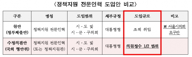 하지만 그동안 서울시의회와 지방의회가 강력하게 주장해온 광역의원 정수내 ‘정책지원 전문인력 도입’은 끝내 개정안에 반영되지 않았다. 지방자치를 이끄는 양 수레바퀴의 한쪽인 지방의회의 의견조차 듣지 않고 국회와 정부의 합의만으로 개정안을 처리했다.