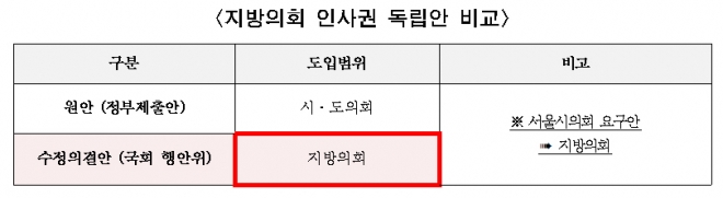 심의과정에서 서울시의회의 요구안과 같이 지방의회 인사권 독립의 도입 범위를 ‘시·도 및 시·군·구의회’ 까지 확대하는 방안도 논의되어, 서울시의회안이 수용되어 의결됐다.