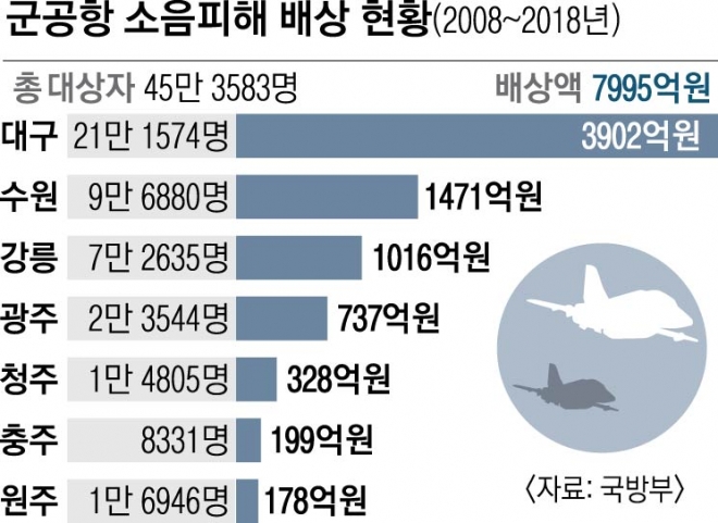 그러나 전국 3개 군공항 가운데 광주와 수원은 사정이 다르다. 수원은 군공항 단독 운영체제라서 이전 대상 지역으로 거론된 화성 주민들의 반발이 만만찮다. 광주공항도 국토부의 제5차 공항개발 중장기 종합계획(2016~2020)과 맞물려 논란이 불가피하다. 광주시·전남도가 날 선 대립을 이어 가는 가운데 양 지역 시민사회단체도 각기 입장을 내세우며 성명전을 펴고 있다. ‘군공항 이전 및 지원에 관한 특별법’ 개정안이 국회 국방위에서 논의 중이나 주민 수용성을 끌어올리기에는 한계가 있을 것으로 점쳐진다. 도심에 있는 군공항 이전이 늦어질 경우 정부는 연간 수백억원의 군공항 소음피해 보상금을 부담해야 하고, 공군 훈련 차질 등 각종 부직용이 우려된다.