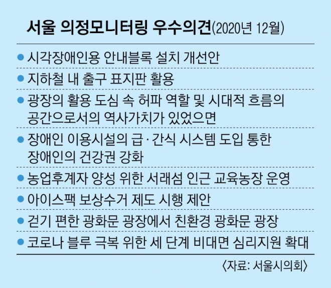 서울시의회는 지난해 12월 의정 모니터에 접수된 123건의 아이디어 중 김태주(강동구)씨가 제안한 ‘시각장애인용 안내블록 설치 개선안’ 등 14건을 우수의견으로 선정했다고 3일 밝혔다. 김씨는 “예전에 도쿄를 방문했을 때 시각장애인용 유도블럭이 우리나라와 같이 횡단보도 앞에서 끝나는 게 아니라 횡단보도 위에도 깔려 있는 것을 봤다”면서 “횡단보도 중앙을 기준으로 시각장애인용 유도블럭을 설치해 시각장애인이 횡단보도를 벗어나지 않고 안전하게 건널 수 있다”며 이 같은 제안을 했다.