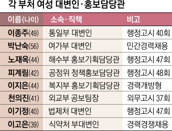 관가에서는 앞으로 여성 대변인·홍보담당관이 더 많아질 것이라고 예상한다. 대변인은 ‘술을 잘 마셔야 한다’거나 ‘업무량이 많아 체력이 강해야 한다’는 인식이 바뀌는 데다가, 코로나19 이후 술자리 자체가 줄고 비대면이 늘어나는 등 분위기도 달라지면서 굳이 ‘남성 공무원이어야 한다’는 논리가 설 자리를 잃고 있기 때문이다. 노재옥 해양수산부 홍보기획담당관과장은 “여성이라는 특성이 사람을 만나고 네트워크를 쌓는 데 도움이 된다”고 말했다. 피계림 공정거래위원회 정책홍보담당관은 “과거에는 공직사회에 여성 비율이 높지 않은 영향이 컸지만 앞으론 달라질 것”이라며 “개인적으로는 특정 성별이 하는 일이 정해져 있다고 생각하지 않는다”고 강조했다.