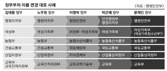 정부가 바뀔 때마다 정부부처나 부서 이름이 뚜렷한 이유 없이 바뀐 사례는 숱하게 찾아볼 수 있다. 대표 사례가 행안부다. 행정자치부·행정안전부·안전행정부·행정자치부를 거쳐 문재인 정부 들어 다시 행안부가 됐다. 계속 바뀌니 관가에서도 부를 때 헷갈려 한다. 행안부 D사무관은 “도돌이표가 따로 없다. 동료들끼리 ‘다음 정부에서는 안전행정부 순서’라는 우스갯소리를 한다”고 귀띔했다.