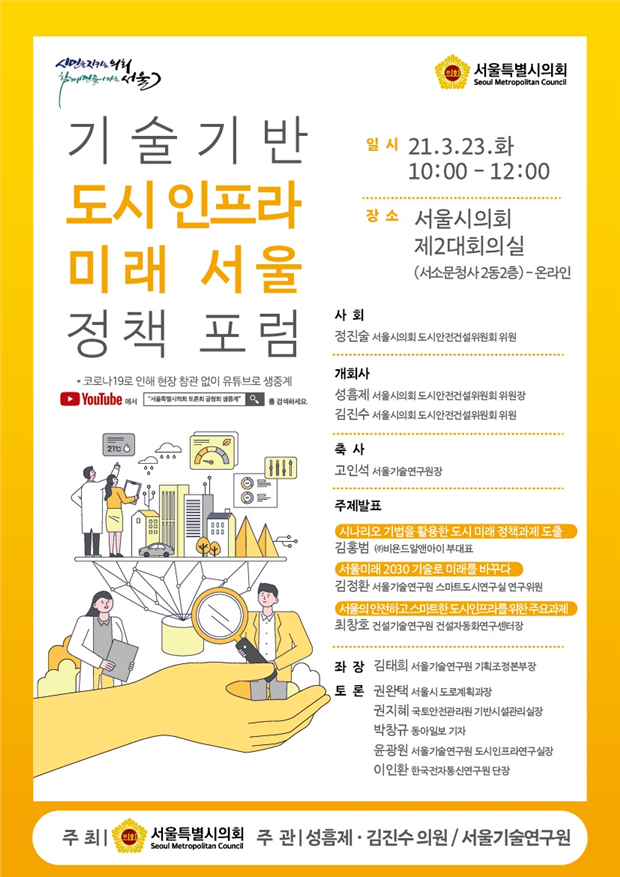 포럼은 코로나19 방역수칙을 준수하기 위해 무청중으로 진행되며, 유튜브를 통해 23일 10시부터 생중계될 예정이다. 유튜브 검색창에 “서울특별시의회 토론회 공청회 생중계“를 입력하거나 (https://url.kr/R8adyO)을 통해 실시간으로 시청할 수 있다.