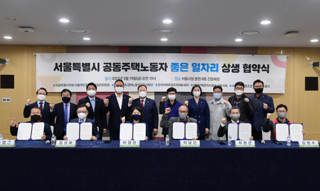 서울시의회 더불어민주당 민생실천위원회(이하 민생실천위원회)는 서울시 주택건축본부, 전국아파트경비노동자공동사업단, 전국아파트입주자대표회의, 대한주택관리사협회 서울시회, 서울일반노동조합이 함께 하는 「서울특별시 공동주택노동자 좋은 일자리 상생협약식」을 19일 서울시청에서 개최했다.