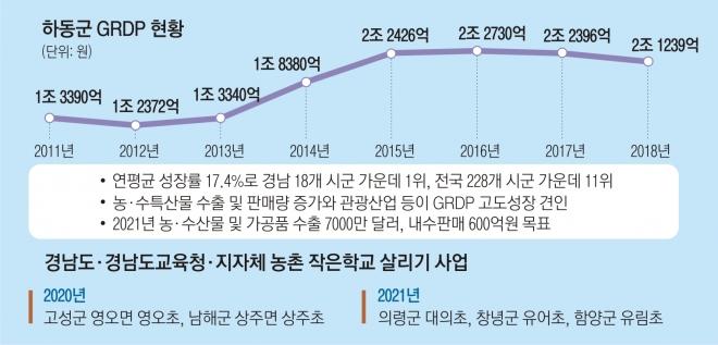 2011~2016년 전국 광역 및 기초지자체 지역내총생산(GRDP) 분석자료에 따르면 경남 하동군은 2011년 1조 3390억원이던 GRDP가 2016년 2조 2730억원으로 증가했다. 연평균 17.4%씩 고도 성장을 한 것이다. 경남도 내 18개 시군 가운데 성장률 1위다. 전국 228개 시군 가운데서도 11위다. 하동군 연도별 GRDP는 2012년 1조 2372억원, 2013년 1조 3340억원, 2014년 1조 8380억원, 2015년 2조 2426억원으로 늘었으며 2016년에 최고 정점을 찍었다. 이후 2017년 2조 2396억원. 2018년 2조 1239억원으로 해외 수출 감소 등으로 주춤하고 있다.