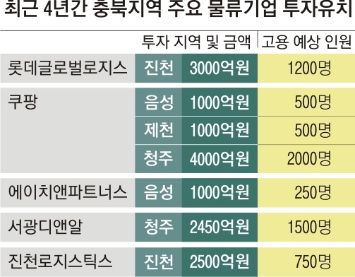 물류 업계가 충북을 선호하는 것은 최대 시장인 수도권과 가깝고 국토의 중심에 위치해 전국 곳곳으로의 상품 공급이 용이하기 때문이다. 경부고속도로와 중부고속도로가 지나가고 평택~제천 간 고속도로와 중앙고속도로도 뚫렸다. KTX 청주오송역이 있어 국내 어디서나 2시간 이내 접근이 가능하다. 청주공항을 통한 해외배송도 가능하다. 이런 여건은 물류기업들의 운송비용 절감, 빠른 배송 등과 직결된다.