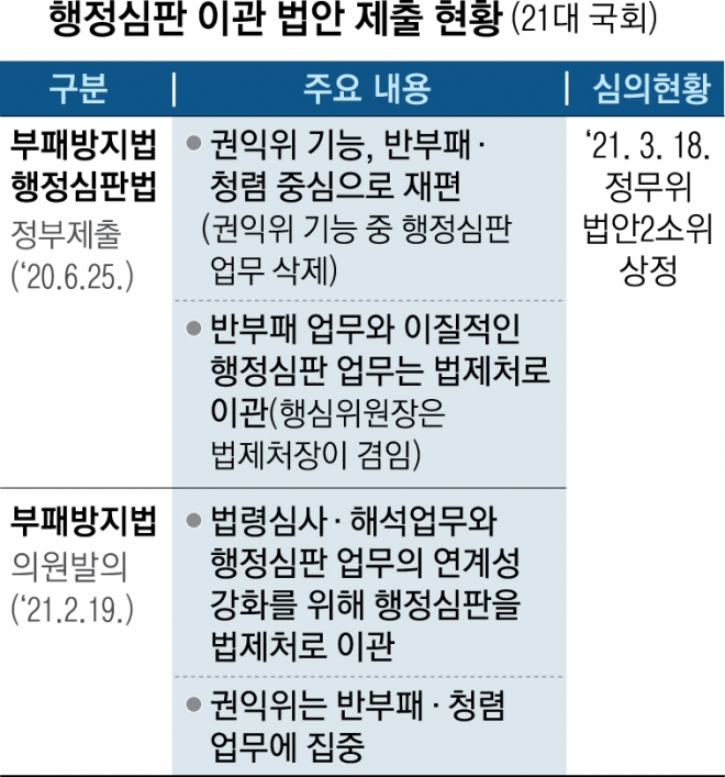 하지만 행정심판은 준사법적 절차이기 때문에 법적 전문성을 갖춘 법제처가 수행하는 것이 더 합당하다는 것이 법제처의 주장이다. 김 수석이 법제처장 시절인 2018년 1월 행정심판 기능을 법제처로 이관하는 내용의 부패방지법과 행정심판법 개정안이 20대 국회에 제출된 것도 이 때문이다.