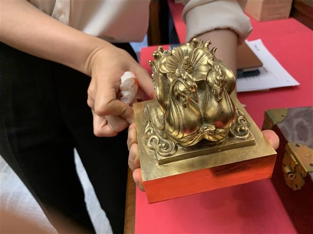 국새 사용 요건은 외교문서, 훈·포장, 공무원 임명장 등 법규에 정해져 있다. 전통 한지에 붓글씨로 직접 내용을 쓴 뒤 국새와 직인을 찍는다. 글씨를 쓰고 국새를 찍는 일을 하는 서예학과 출신 곽상혁(39) 행안부 상훈담당관실 주무관은 매일 많게는 몇백장에 이르는 각종 임명장과 훈·포장을 쓰고 국새를 찍느라 손바닥에 굳은살이 박였다. 국새 자체가 무거운 데다 혹시라도 떨어뜨릴까 집중해야 한다. 국새를 문서 한가운데 정확하게 내려놓은 뒤 골고루 찍히도록 온몸에 힘을 줘 눌러야 한다. 행안부 관계자는 “관례에 따라 임기가 끝날 때 대통령이 수여하는 훈장을 받는 주한 대사들이 붓글씨 위에 국새가 찍힌 걸 귀국 기념품이라며 좋아한다”고 귀띔했다.