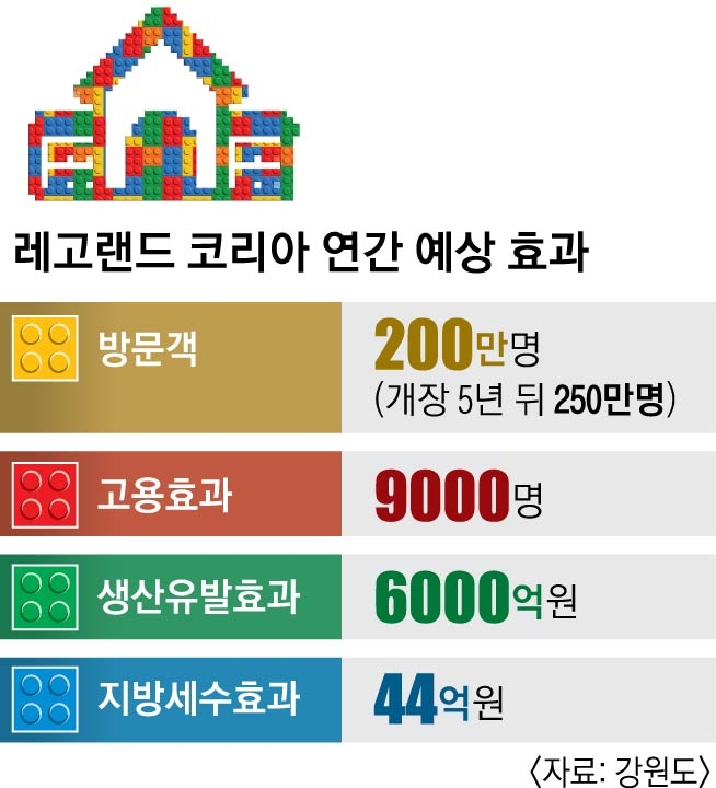 전 세계 레고랜드의 매출액 26%가 종사자들의 인건비로 지출되는 것에 비춰 보면 해마다 약 260억원이 춘천과 강원도 지역에 남게 되는 셈이다. 취득세·재산세 등 지방세수도 연간 44억원이 더 걷힌다. 인구 28만여명의 춘천에 굴뚝 없는 대단위 공장이 들어서는 셈이다.