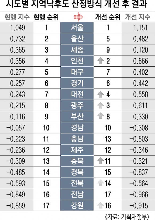 기재부의 새로운 선정방식을 적용하면 광주는 8위에서 3위, 대전은 7위에서 4위로 껑충 올라가 대형 지역개발사업 추진에 치명적 영향을 줄 것이라는 분석이다.