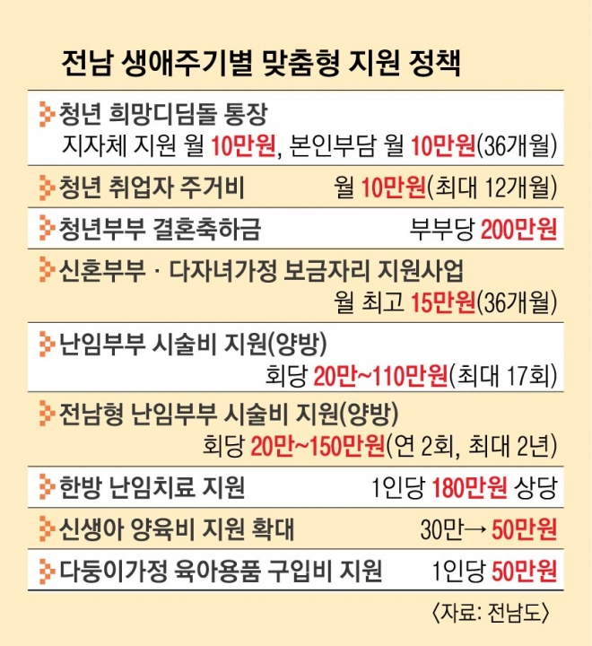 “전국에서 가장 많은 공공산후조리원 5곳을 조성했다. 지난해 ‘제15회 임산부의 날 기관표창’도 받았다. 신혼부부 지원도 아끼지 않는다. 무주택 가정에 주택구입 대출이자를 월 최고 15만원(36개월) 지원하는 ‘신혼부부·다자녀가정 보금자리 지원사업’은 주택구입에 따른 경제적 부담을 덜어 준다. 최근 늘어나는 난임부부를 위해 ‘양·한방 난임치료’도 해 준다. 특히 한방난임치료 지원대상을 여성에서 부부로 확대하고, 시술비 지원이 종료된 부부를 추가 지원하는 등 섬세한 결혼·출산 장려정책을 시행한다. 이러한 노력에 힘입어 지난해 전남도 합계 출산율은 1.15명으로 전국 2위를 달성했다. 올해에는 청년부부 결혼축하금 200만원, 신생아양육비 지원 확대 50만원, 다둥이가정 육아용품 구입비 1인 50만원을 새롭게 도입하는 등 출산율 제고에 박차를 가하고 있다.”
