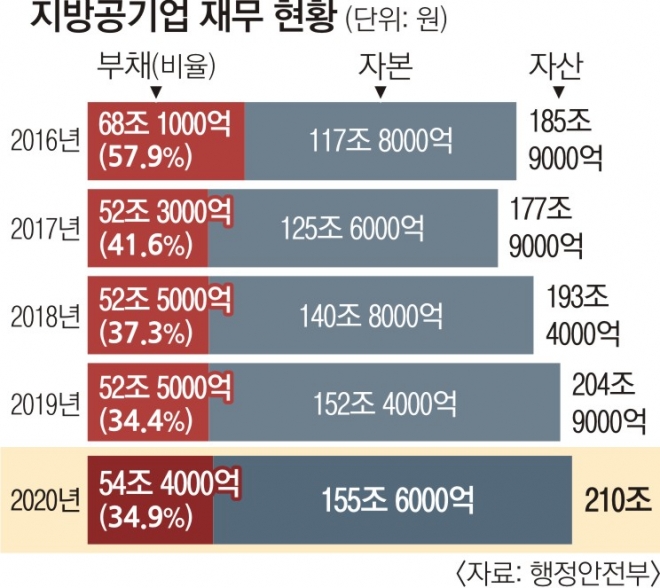 지방 공기업 부채비율(자본 대비 부채)은 34.9%로 전년보다 0.5% 포인트 올랐다. 부채비율은 2016년 57.9%, 2017년 41.6%, 2018년 37.3%, 2019년 34.4% 등으로 하락하다가 지난해 소폭 상승했다. 박재민 행안부 지방재정경제실장은 “코로나19의 영향으로 상하수도와 도시철도 등이 경영난을 겪었지만 부채비율은 30%대로 안정적으로 유지되고 있다”고 말했다.