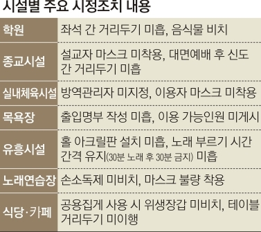 정부합동 특별방역점검단이 지난달 8일부터 지난 1일까지 25일간 서울·경기·인천 등 수도권과 부산 지역의 유흥시설과 학원, 실내체육시설 등 감염 고위험 시설을 점검한 결과에 따르면 모두 1만 1210건의 위반 사례가 적발됐다. 하루 평균 448건에 이른다. 위반 사례별 조치로는 방역 수칙을 어겨 고발된 경우 14건, 영업정지 27건, 과태료 73건, 시정 1212건, 안내 및 계도 9884건 등이다.