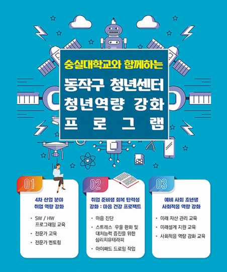 동작구는 청년들의 다양한 취업기회 제공 등을 위한 ‘동작구 청년센터 청년 역량 강화 프로그램’ 수강생을 모집 중이라고 10일 밝혔다. 이번 사업은 지난 3월 고용노동부 주관 ‘청년센터 운영 사업’ 공모에 선정돼 예산 1억 9000여 만원을 확보해 추진하는 것이다. 프로젝트는 미취업 청년(만 18~39세) 등에게 4차 산업 기본교육 과정을 교육해 새로운 진로를 모색하는 데 도움을 주고 미래 산업구조에 적합한 인재를 양성하는 것을 목표로 하고 있다.