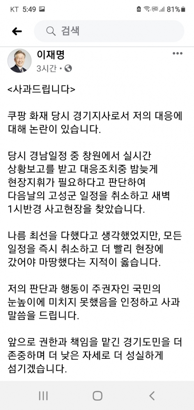 이 지사는 이날 자신의 페이스북에 올린 글에서 “저의 판단과 행동이 주권자인 국민의 눈높이에 미치지 못했음을 인정하고 사과 말씀을 드린다”고 사과했다.