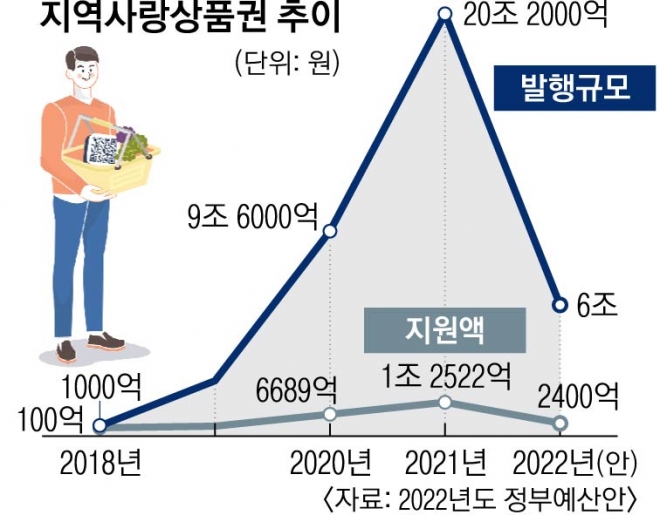 지역사랑상품권은 지방자치단체가 발행하고 해당 지자체에 있는 소상공인·자영업자 가맹점에서만 사용하도록 한 상품권이다. 1997년 외환위기 당시 시민단체가 지역화폐 실험을 하면서 첫선을 보인 뒤 지자체에 확산됐고 지난해 ‘지역사랑상품권 이용 활성화에 관한 법률’도 제정됐다. 코로나19로 인한 소상공인 지원 필요성으로 인해 발행액은 2019년 2조 3000억원, 2020년 9조 6000억원, 2021년 20조 2000억원으로 급증했다. 정부 지원액도 2018년 100억원, 2020년 6689억원, 2021년 1조 2522억원으로 크게 늘었다.