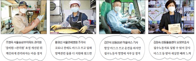 구는 무엇보다 코로나19 예방을 위한 안전장구를 제공하는 데 주력했다. 지난 1년간 4차례에 걸쳐 마스크 135만 1160장, 손소독제 7만 5992개를 필수노동자들에게 무상 지급했다. 무료 독감예방접종(1578명)과 격무에 시달리는 필수노동자를 위한 심리치료 프로그램(216명)도 지원했다. 필수노동자에 대한 가치를 재조명하기 위한 캠페인도 벌였다. 전국 최초로 아파트 경비원이라는 호칭을 ‘관리원’으로 개선하고 에어컨 설치 및 냉방비를 지원한 게 대표적이다. 지난 10일 성동구청에서 열린 ‘필수노동자 간담회’에서 아파트 관리원으로 일하는 조씨는 “관리원으로 호칭이 바뀌면서 자부심을 갖게 됐다”며 “더 깨끗하고 안전하게 아파트를 돌봐야 한다는 마음가짐이 생겼다”고 말했다.