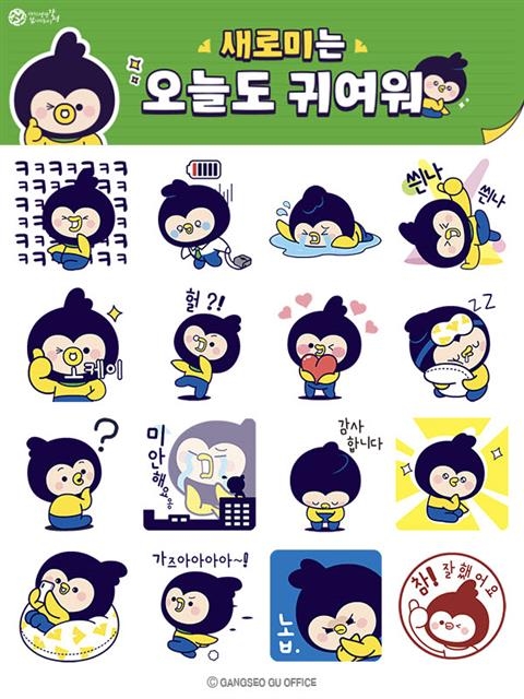 새로미는 구 상징물 중 하나인 까치를 이용해 만든 공식 캐릭터다. 기쁜 소식을 전하는 친근하고 따스한 친구라는 의미를 담아 1994년 처음 제작됐다. 이번에 지역 주민들과 더 친근하게 소통하기 위해 새로 만든 캐릭터는 까치를 닮은 외모에 구 상징 나무인 은행나무를 뜻하는 노란 옷을 입고 있다. 함께 제작한 움직이는 이모티콘은 ‘오케이’, ‘미안’, ‘신나’ 등 다양한 감정을 담아 누구나 쉽고 재밌게 사용할 수 있도록 만들어졌다.
