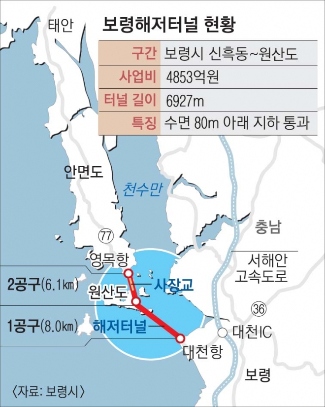 3일 충남도에 따르면 해저터널은 역대급이다. 보령시 신흑동 대천항 근처에서 원산도까지 해저터널 6927m는 전국 최장이다. 기존 인천북항해저터널 5.46㎞보다 1.5㎞ 더 길다. 전 세계로 따지면 일본 도쿄아쿠아라인 9.5㎞, 노르웨이 봄나피요르드 7.9㎞·에이커선더 7.8㎞·오슬로피요르드 7.2㎞에 이어 다섯 번째다. 영국과 프랑스 간 도버해협을 관통하는 유로터널은 38㎞에 이르지만 차량이 아닌 기차가 다니는 해저터널이다.