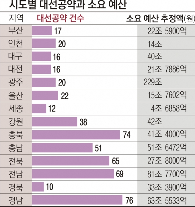 서울신문이 29일 서울·경기·제주를 제외한 전국 14개 시·도가 요구한 대선 공약을 조사한 결과 모두 506건이나 됐고 소요 예산은 689조 3851억원에 이르렀다. 지역별로는 부산 17건(22조 5900억원), 인천 20건(14조원), 대구 16건(40조원), 대전 16건(21조 7886억원), 광주 20건(229억원), 울산 22건(15조 7602억원), 세종 12건(4조 6858억원), 강원 38건(42조원), 충북 74건(41조 4000억원), 충남 51건(54조 6472억원), 전북 65건(27조 8000억원) 등이다.