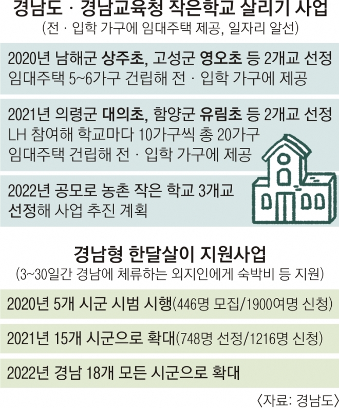 경남도 청년인구 지키기 정책 가운데 ‘농촌 작은학교 살리기’와 ‘경남형 한달살이’가 특히 전국적인 관심을 끌고 있다. 농촌 작은학교 살리기는 젊은 인구 감소로 소멸과 폐교 위기에 놓인 농촌 마을과 학교를 동시에 살리기 위해 농촌 학교 전입 가구에 주택·일자리 등을 알선하는 정책이다. 경남형 한달살이는 외지인이 한 달간 경남에 머무르며 지역 문화와 생활을 체험할 수 있도록 지원하는 전입 유도형 관광지원 사업이다.