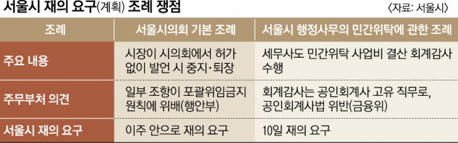 아울러 시는 지난 10일 시의회 측에 ‘서울시 행정사무의 민간위탁에 관한 조례 개정안’에 대한 재의를 요구했다. 지난해 12월 22일 시의회를 통과한 이 조례는 공인회계사 뿐 아니라 세무사도 민간위탁 기관의 회계감사를 할 수 있도록 했다. 주무 부처인 금융위원회는 “공인회계사법에 따라 회계감사는 회계사의 고유직무”라고 해석했다. 시는 금융위 의견을 붙여 해당 조례를 시의회로 다시 돌려보냈다. 서울시의회 주변에서는 해당 개정안에 대해 세무사 업계의 ‘입김’이 반영된 결과가 아니냐는 분석도 나온다.
