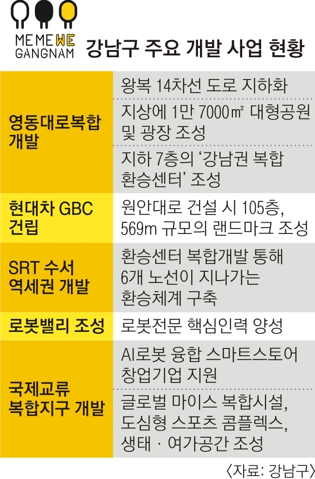 “영동대로 일대는 GBC 건립을 중심으로 대한민국의 새로운 100년을 이끌어갈 공간으로 변화를 앞두고 있다. 지난해 5월 착공한 GBC가 원안대로 2026년 완공되면 105층, 569m 규모로 우리나라 최고층 빌딩으로 우뚝 설 예정이다. 옥상에 드론택시 착륙장을 만드는 등 미래항공교통(UAM)이 추가되면 시너지 효과는 상상을 초월한다. 또 GBC와 강남권 광역복합환승센터, 코엑스를 합치면 잠실야구장 30배 면적에 달하는 22만㎡로, 국내 초대형 지하도시로 탈바꿈된다. 아울러 수서역세권 개발로 새로운 세상이 열린다. 2027년 개발이 마무리되면 강남의 변방에서 서울의 관문으로 탈바꿈하게 된다. 교통 요충지라는 특성을 살려 수서역 일대에 로봇밸리가 조성된다.”