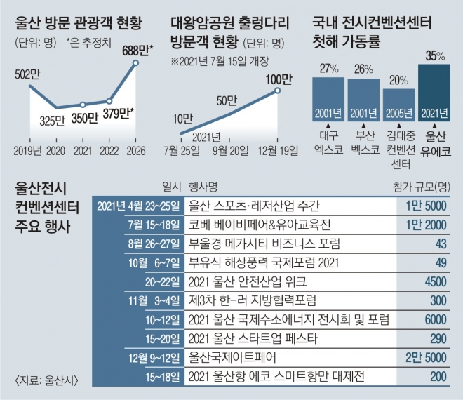 또 조선도시 동구에는 고급 숙박시설과 휴양시설을 갖춘 해양 중심 체류형 관광지가 조성된다. 동구 관광산업의 핵심은 대왕암공원이다. 대규모 해송 군락과 기암괴석 등으로 유명한 대왕암공원에는 지난해 해상 출렁다리가 설치돼 관광객들의 발길이 이어지고 있다. 길이 300여m의 출렁다리는 개통 5개월 만에 방문객이 100만명을 넘어섰다. 빠르면 연내 해상 케이블카, 집라인, 스카이워크도 착공한다.