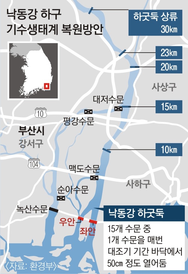 부산시는 낙동강유역 물관리위원회가 ‘낙동강 하구 기수(민물과 바닷물이 섞이는 수역) 생태계 복원방안’을 의결했다고 10일 밝혔다. 매월 대조기(보름과 그믐 무렵 밀물이 가장 높은 때)에 3~6차례 개방한다는 게 부산시의 설명이다.