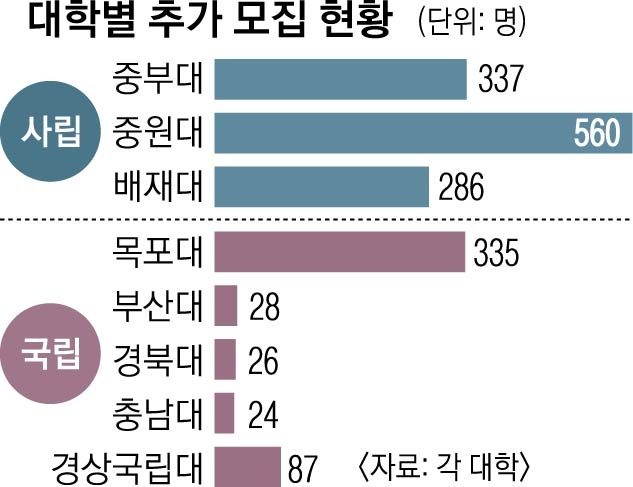 수도권과 비교적 가까운 충남대는 24명, 한밭대는 29명을 추가 모집한다. 충남대 관계자는 “학생들의 ‘인서울’ 욕구가 워낙 강해 지방의 국립대 사정이 사립대보다 크게 낫지 않고, 서울에서 먼 영호남 국립대보다 우리가 낫다고 보기도 어렵다”고 말했다.