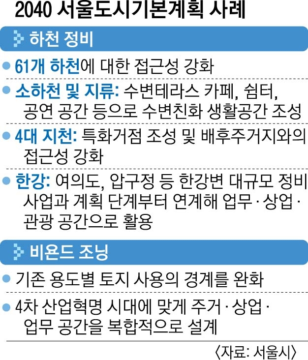 7일 서울시 등에 따르면 서울시 2040 계획 중 35층 규제 완화 외에도 4대 지류 하천(중랑천·홍제천·탄천·안양천) 정비와 비욘드 조닝 사업이 상당 부분을 차지하고 있다.