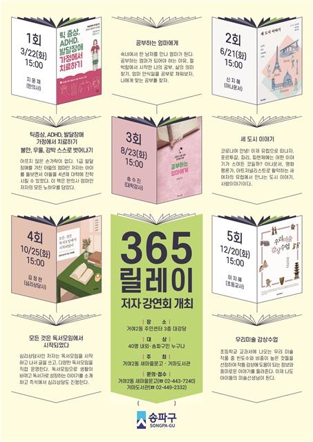 송파구민 누구나 참여 가능하며 매회 40명 신청을 받는다. 박성수 송파구청장은 “이번 강연회를 통해 다양한 분야의 저자와 만나 주민들이 일상 속에서 책과 함께하는 독서문화를 접할 수 있을 것”이라면서 “앞으로도 지역문화가 풍성해지도록 힘쓰겠다”고 말했다.