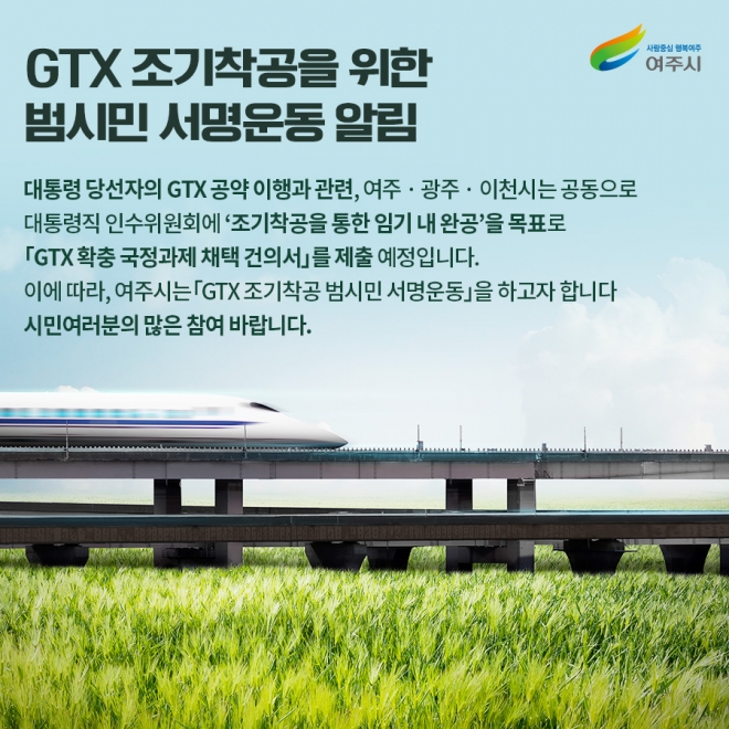 “수도권 동남부 GTX, 대통령 임기 내 완공해요” 여주시, 조기착공을 위한 범시민 서명운동