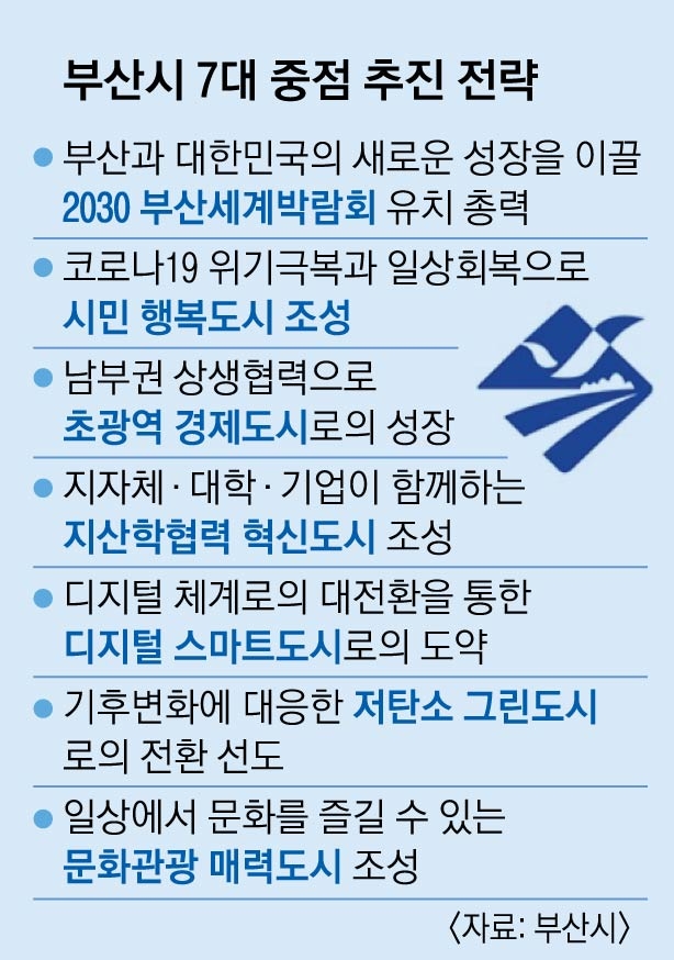 “완전한 일상회복과 경제활력 제고를 최우선 과제로 삼고, 2030 부산세계박람회 유치에 시정 역량을 집중하고 있다. 부·울·경메가시티를 통한 초광역 경제협력으로 수도권에 대응하는 기반을 구축할 계획이다. 코로나19로 어려움을 겪는 골목 상권과 소상공인 지원 등 민생경제 안정에도 힘쓰고 있다. 국내외 글로벌 기업 유치, 디지털 신산업 육성, 지·산·학 협력체계 강화 등을 통해 지역경제 체질을 혁신해 나가겠다.”