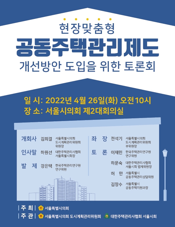 서울특별시의회 도시계획관리위원회(위원장 김희걸)와 대한주택관리사협회 서울시회(회장 하원선)가 공동으로 주관하는 이번 토론회는 서울시민의 약 70%가 거주하고 있는 공동주택의 관리제도 전반에 걸친 개선방안을 모색하기 위해 마련됐다.