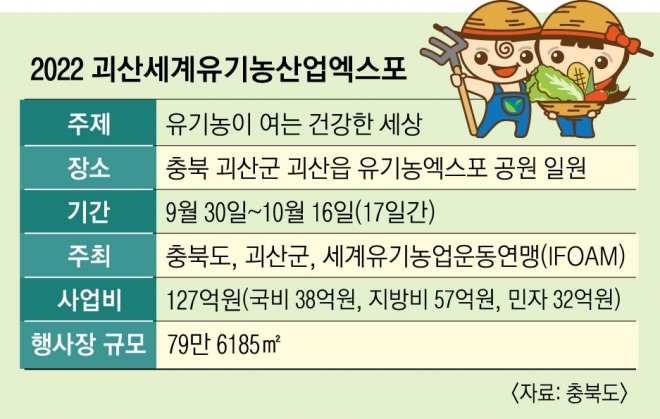 충북도는 오는 9월 30일부터 10월 16일까지 17일간 괴산군 괴산읍 유기농엑스포공원 일원에서 2022 괴산세계유기농산업엑스포를 개최한다고 25일 밝혔다. 행사의 주제는 ‘유기농이 여는 건강한 세상’이다.