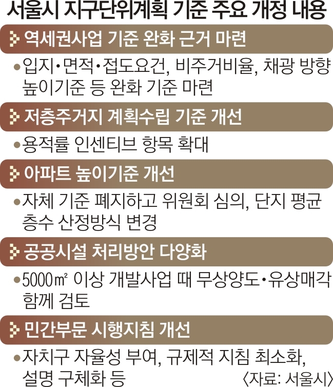 이 밖에도 각 자치구에 권한과 책임을 부여해 일률적으로 적용됐던 민간부문 시행 지침은 자치구 심의 및 자문을 통해 지역 여건에 맞춰 유연하게 변경할 수 있게 했다. 서울시는 5년마다 지구단위계획 수립 기준을 재정비해 도시계획 관련 규제를 지속적으로 개선할 계획이다.
