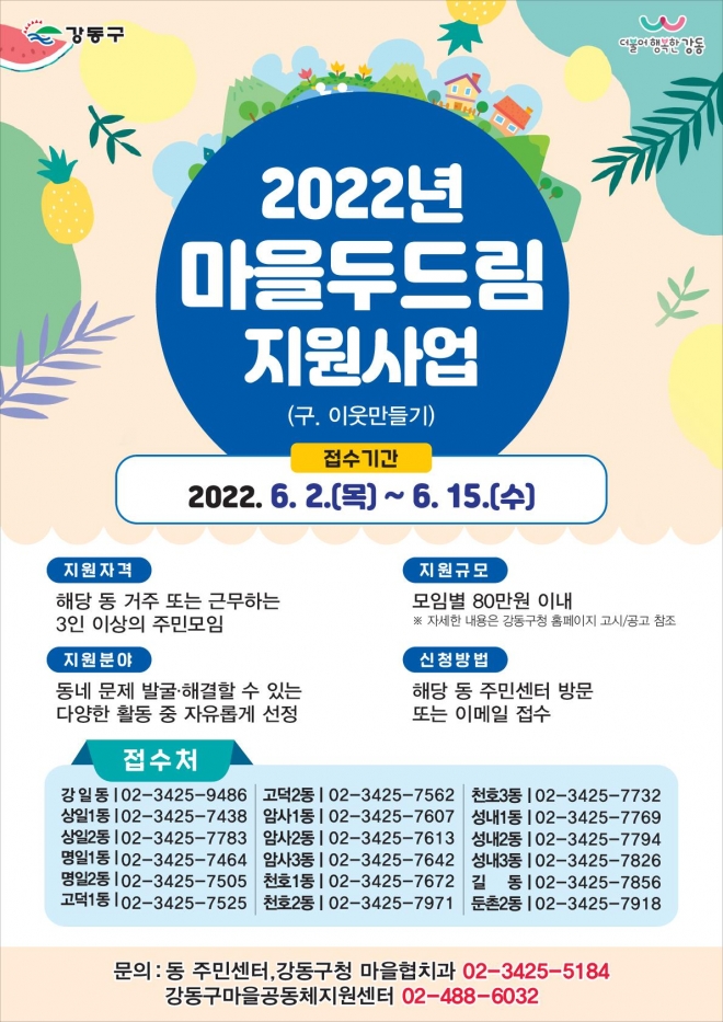 공모사업 접수기간은 6월 2~15일까지로 사업제안서, 사업계획서 등 필요한 서류를 동 주민센터에 직접 방문하거나 동별 담당자 이메일을 통해 제출하면 된다.‘강동구마을공동체지원센터’ 유튜브 채널에 게시된 공모사업 설명회 영상을 통해 마을공동체 사업에 대한 내용과 추진 일정 등을 확인할 수 있다.