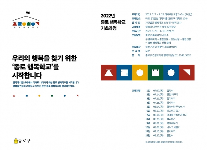 종로구는 지난해부터 지방자치단체 최초로 행복을 배우고 익히는 프로그램을 운영하고 있다. 구 관계자는 “전문가, 주민과 꾸준히 소통하며 종로 행복학교를 주민을 위한 어른성장학교로 조성하기 위해 최선을 다하겠다”고 말했다.