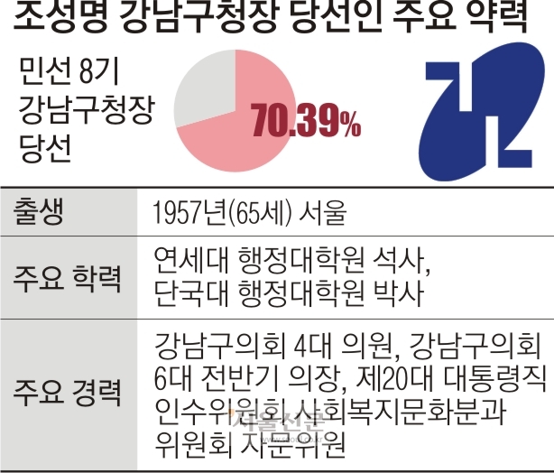 70.39%의 압도적인 지지를 받아 민선 8기 강남구를 이끌게 된 조성명 국민의힘 강남구청장 당선인은 민선 이후 첫 강남구 ‘토박이’ 강남구청장이다. 충남 당진 출생이지만 10대에 서울로 올라와 강남에 터를 잡은 뒤 40년 넘게 강남구에서만 살아왔다. 서울의 ‘보수 1번지’로 꼽히는 강남구 구민들은 2018년 민선 이후 첫 민주당 구청장을 선출했지만 이번엔 지역 토박이 후보에게로 표심을 되돌렸다. 조 당선인의 70.39% 지지율은 서울 25개 자치구 중 서초구청장에 당선된 전성수 당선인의 70.87%에 이어 두 번째로 높다.