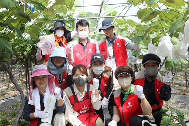 롯데아울렛 광주수완점 샤롯데 봉사단은 20일 광주 북구 운정동 농가를 찾아 500여평에 조성된 포도나무에 종이 봉지를 씌우는 작업을 실시했다. 포도 봉지는 포도의 당도를 높이고 착색을 시키는 동시에 병충해를 예방하는 역할을 한다. 봉지 씌우기는 수작업으로 진행되기 때문에 많은 일손이 필요하다.