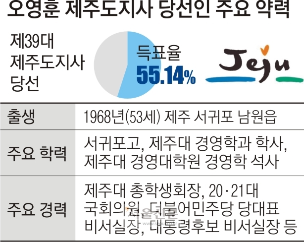 다만 그는 현재의 제주공항 활주로는 남북이 아닌 동서로 뻗어 있어 강풍이 불 땐 이착륙 난도가 높아 제주공항 확장에 대해서는 난색을 표했다. 오 당선인은 “무엇보다 우선돼야 할 것은 제주도민의 자기 결정권 보장”이라며 “아무리 국책사업이라고 해도 도민들의 호응 없이는 추진하면 안 되며 도민의 이익에 부합하는지 판단하겠다”고 덧붙였다.