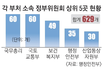 이상민 행정안전부 장관이 5일 국무회의에 보고한 ‘정부위원회 정비 추진계획’에는 존치 필요성이 줄었거나 운영실적이 저조한 정부위원회를 전수조사하고 최소 30%를 줄이는 내용이 담겨 있다. 정부위원회는 이명박 정부 시절 530개에서 박근혜 정부 때 558개, 문재인 정부 때 631개까지 증가했다가 현재 629개다.