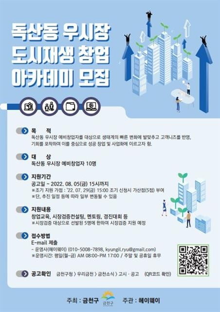 이 프로그램은 독산동 우시장 예비창업자들이 창업 생태계 변화에 발맞추고 지역 특성을 반영한 창업을 할 수 있도록 지원하는 프로그램이다. 심사를 거쳐 선정된 예비창업자들은 ▲스타트업 생태계의 이해 ▲시장조사 방법론 등 창업 교육과 1대1 전문가 멘토링을 받을 수 있다.