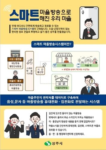 경북 상주시도 지난달부터 스마트 마을방송 시스템(포스터)을 운영하고 있다. 스마트 마을방송 시스템은 마을 이·통장이 스마트폰이나 ARS전화를 이용해 마을 주민들에게 동시에 공지사항을 정확하게 전달할 수 있는 시스템으로, 주민들은 등록된 전화번호로 편리하게 공지사항을 들을 수 있다는 장점이 있다.